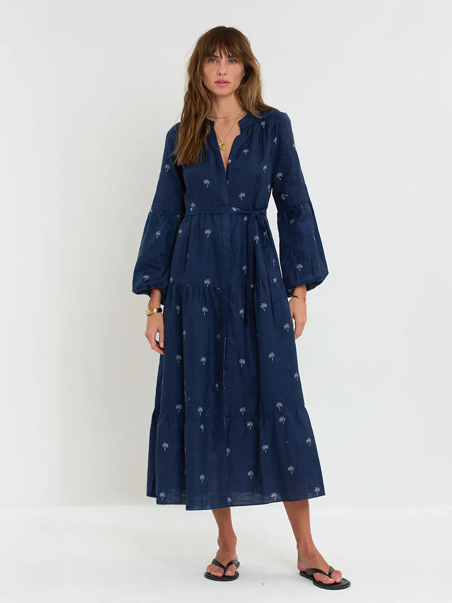 The Zafi Navy Collection from Lemlem features a custom-designed palm print in ivory on a classic, navy background.