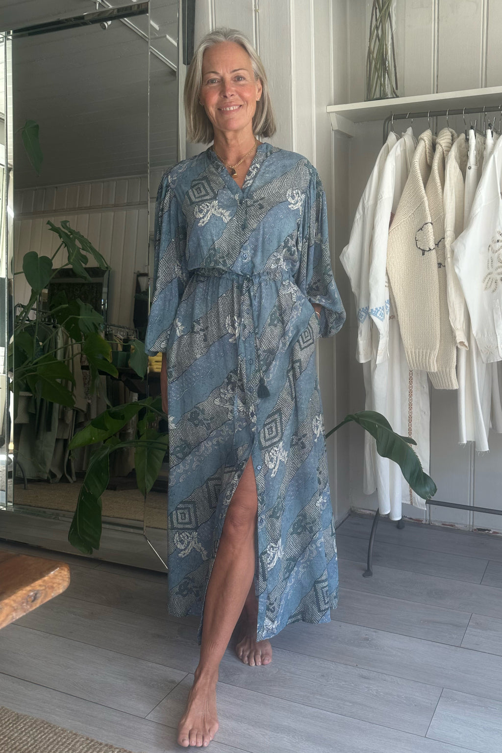 A nod to 70's Ibiza, the Noor dress features hand dyed floral patterns, a self ruching waist, elastic cuff and button-through front. Dress Noor up or down, she will work hard for you through the warmer months.