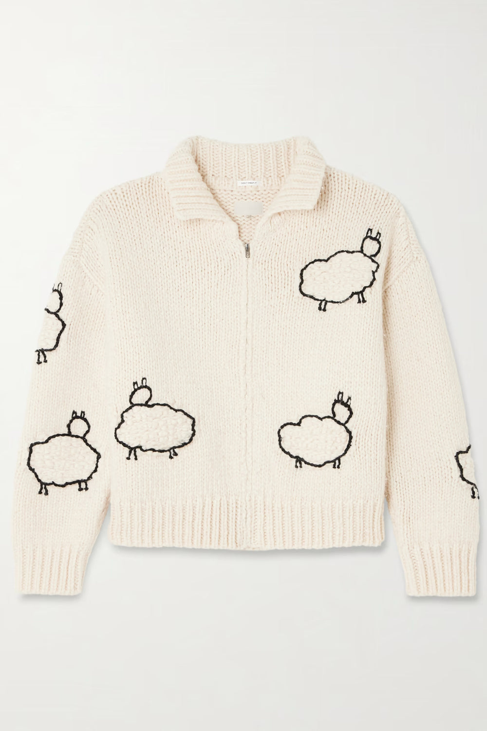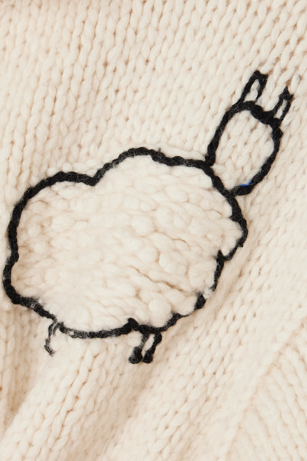 'The Crop Raquette' cardigan is hand knitted from a wool and cotton-blend for a chunky handle and it charmingly features an embroidered flock of sheep. Mother says "We stand for having fun, and not taking yourself too seriously" - we love this playful piece slipped over a simple shirt or tee and worn with jeans, blue, black or tonal.