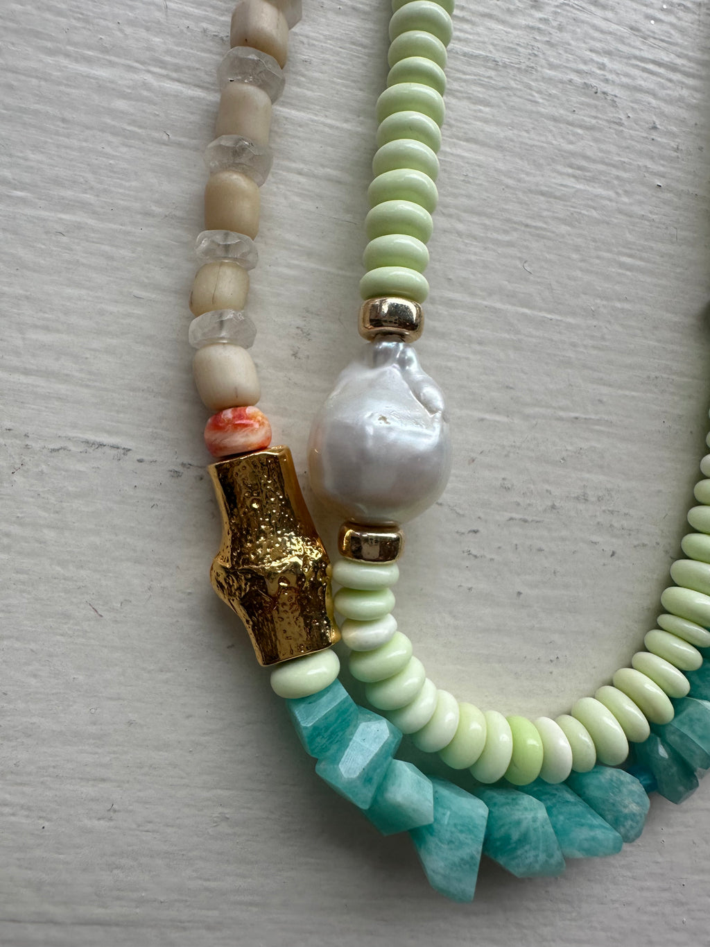 -Gold-plated brass, amazonit, apatite,  honeydew quartz,  lemon chrysoprase, blue lace agate, freshwater pearls