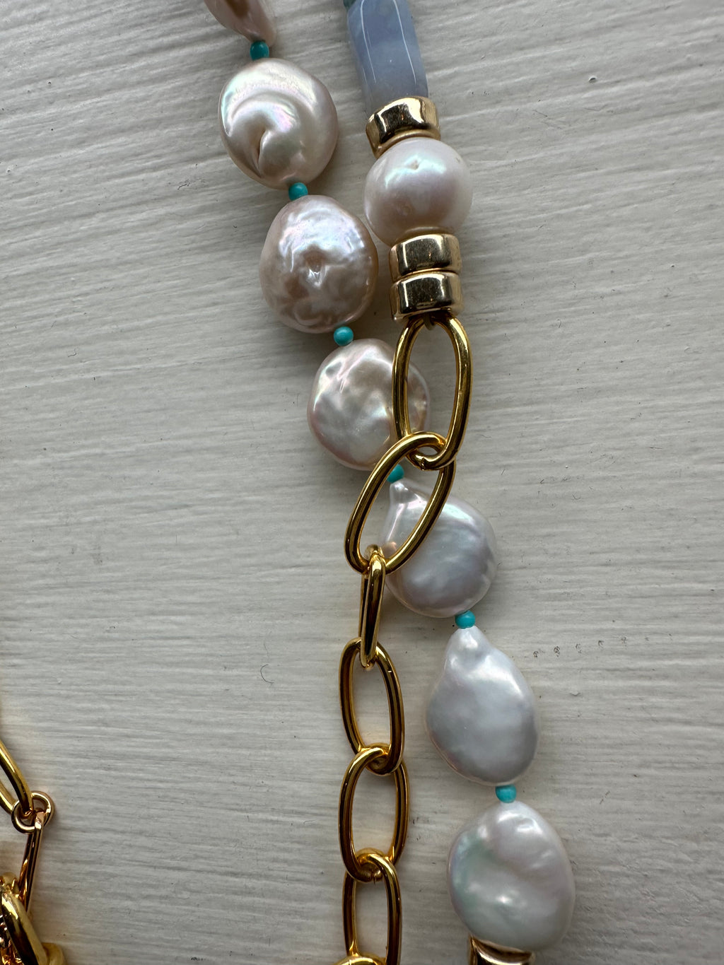 Featuring semi-precious stones and fresh water pearls, 18 carat gold plated. Immaculate.
