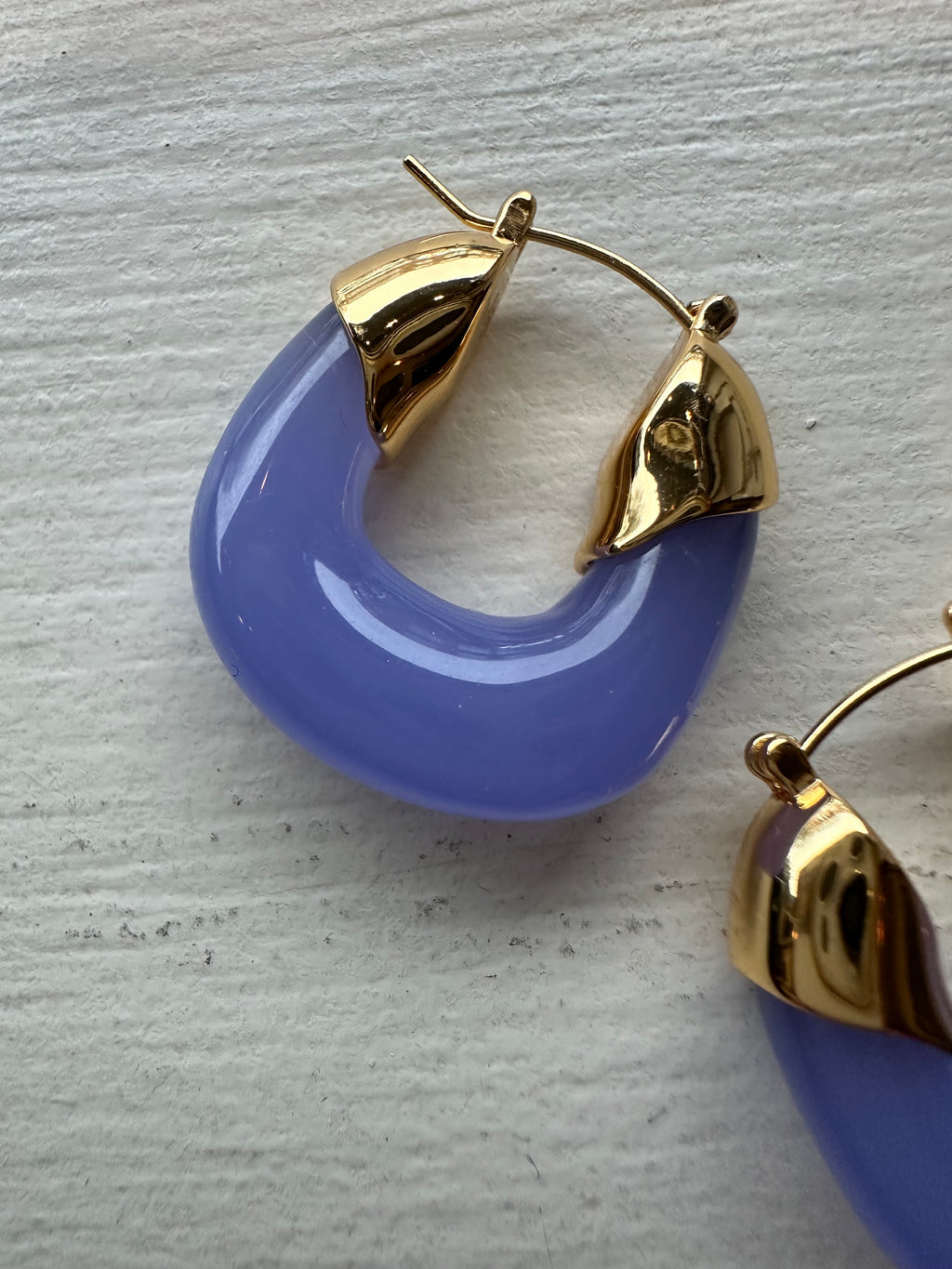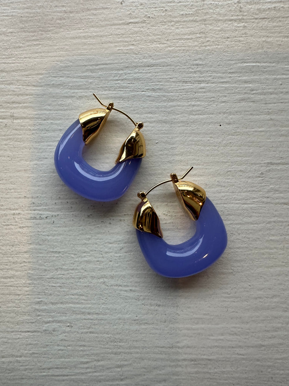 These mini organic hoop earrings in periwinkle are part of Lizzie Fortunato`s core artisanal jewellery collection. Handcrafted from 18 carat gold-plated brass they feature blue resin for a pop of colour. Perfect for a special occasions and lunches out, wear yours with jeans and a crisp white shirt or team with your Summer dresses. No tarnishing.
