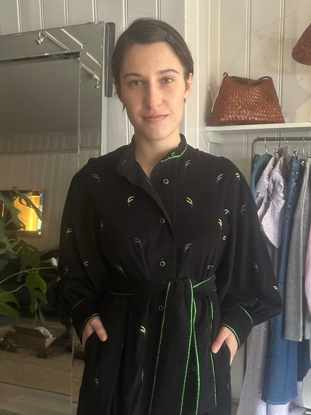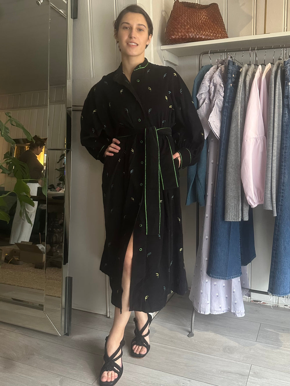 This stunning dress from Thierry is covered with hand embroideries on a black background.