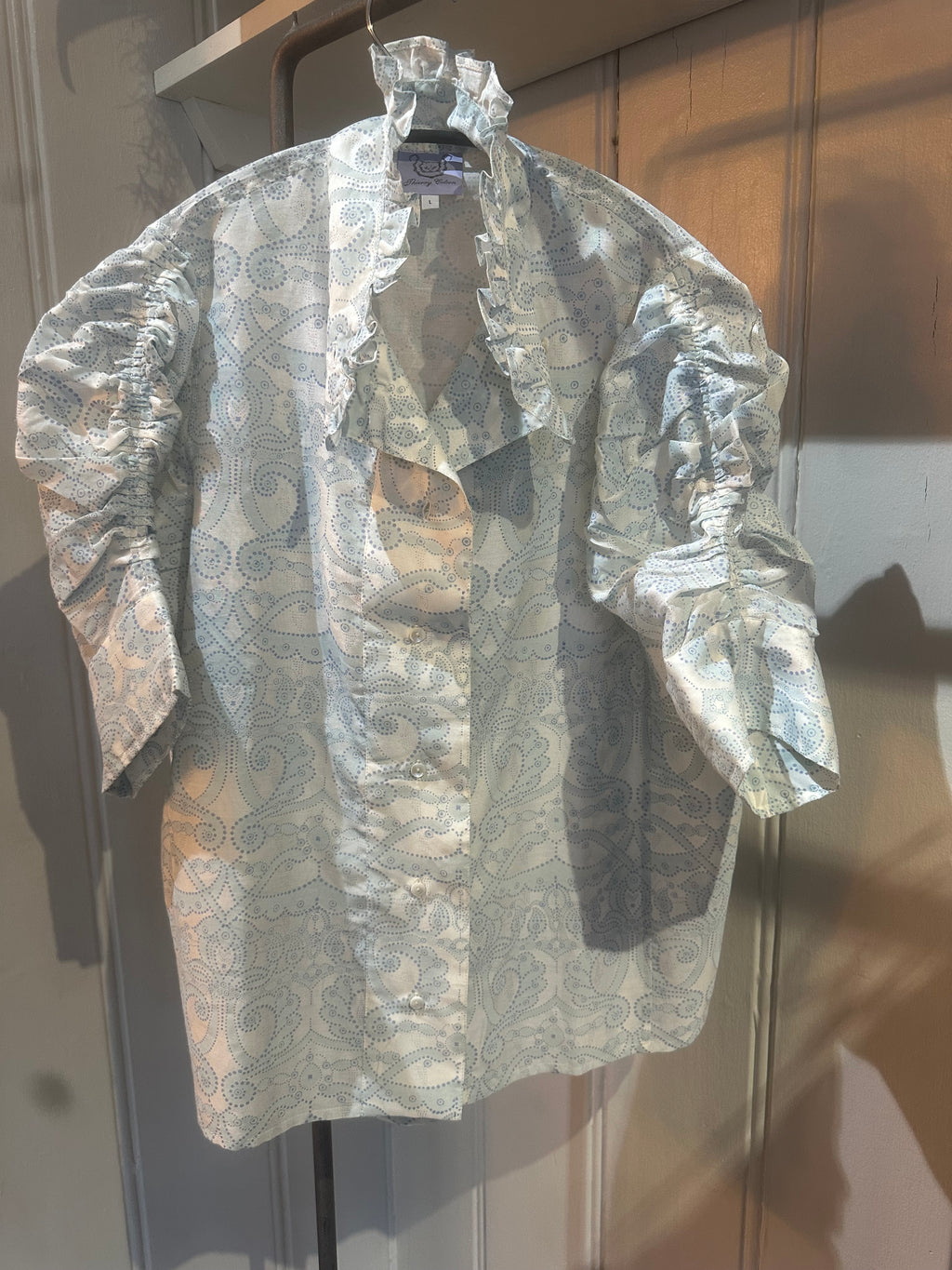 Iconic Vita, crafted from a silk and cotton blend the blouse geatures layers of hand block printing and a nod to the Edwardian era. Tuck yours into jeans or tailored pants.